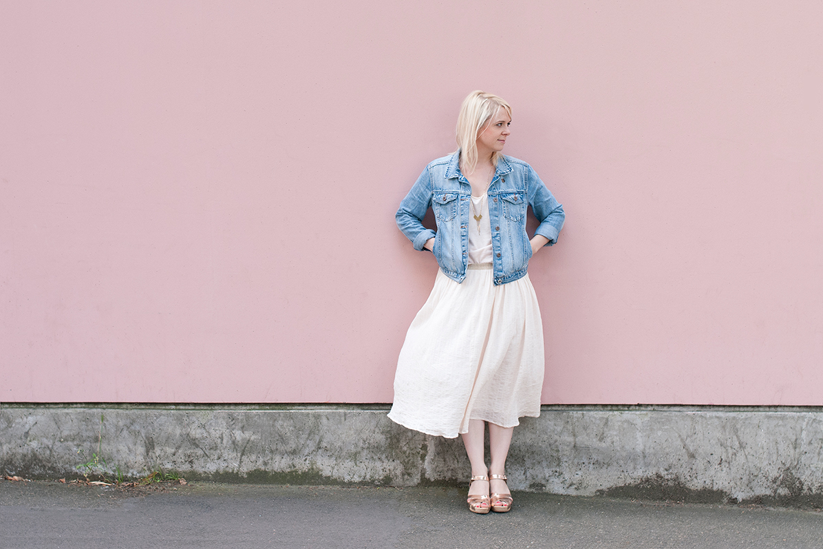 Cette tenue, c’est un peu mon uniforme du moment. Bon sans le blouson en jean, il va sans dire ! J’adore le rose, d’ailleurs je constate avec amusement que depuis que je suis free lance, mon dressing a littéralement changé. Avant il était plutôt gris, bleu marine, blanc et maintenant, il est hyper coloré. Je ne sais pas si c’est l’époque actuelle, mais j’ai envie de couleurs joyeuses. J’ai envie de revenir aux couleurs qu’elles soient pastel et douces ou franches et flashy. J’ai envie de joie dans mes tenues ^^ Et ce petit rose poudré, est juste parfait, doux comme j’aime. Même s’il fait ton sur ton avec mon teint de bidet…